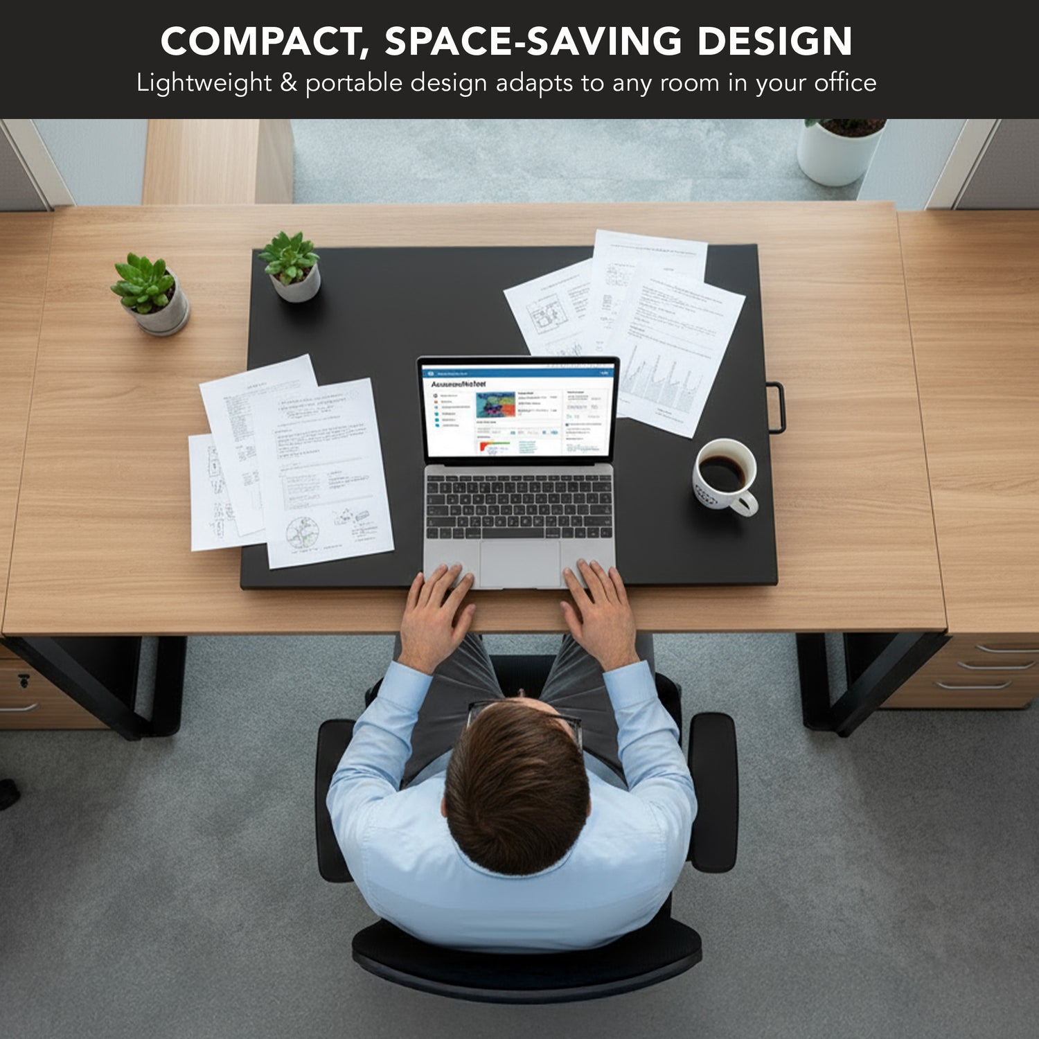 The X-lift base design allows this table top standing desk to raise or lower straight up and down, providing more stability and saving space