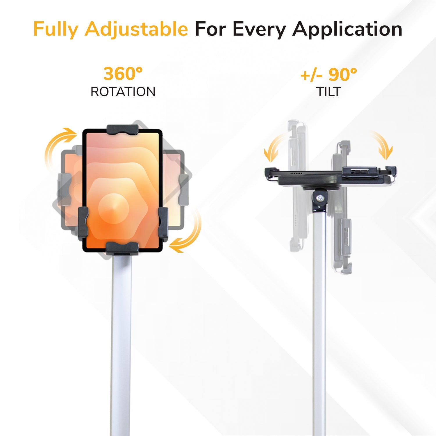 A retail inspired universal tablet stand highlighted by the tilting, swiveling and rotating anti-theft tablet holder. With the easy-to-use locking tablet mount you will speed up your checkout process, increase shopper engagement, loyalty sign-ups, and guest registration. Pre-drilled holes allow you to attach the stand to the floor for additional security. Buy with confidence, made from high grade materials with a matte finish, this tablet stand is perfect for any setting.